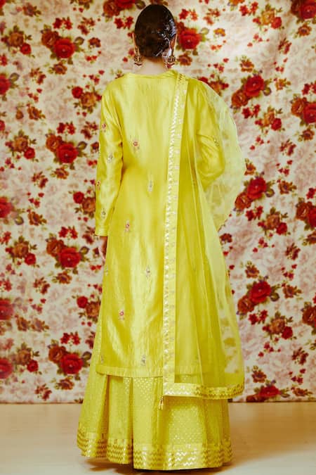 Yellow Silk Embroidered Kurta Lehenga Set