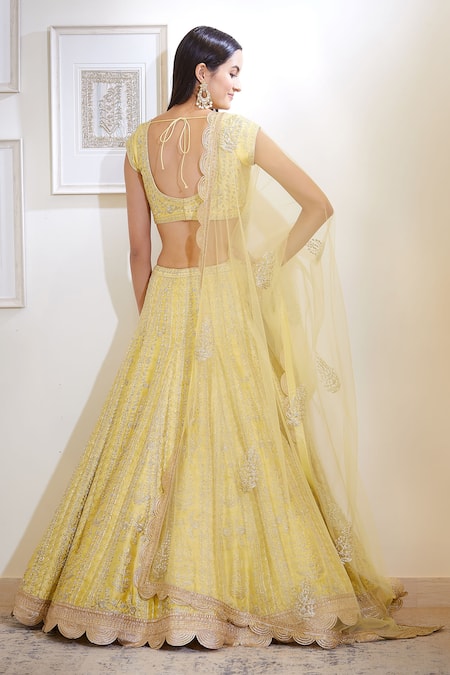 Yellow kalidar lehenga embroidered with zari dori work. Comes with matching blouse & sheer embellished dupatta.
