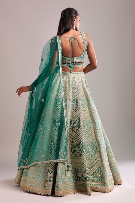 Teal Silk, Organza Embroidery V-neck Gold Dori Lehenga Set