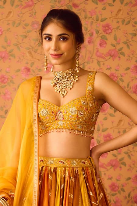 Yam golden yellow lehenga featuring floral brocade panels with a side tie-up and cascading latkans. Paired with a padded blouse adorned with zardozi hand embroidery and a matching dupatta, along with an embroidered belt.