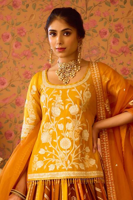 Yellow Organza, Viscose, Yam Floral Brocade Tunic And Lehenga Set