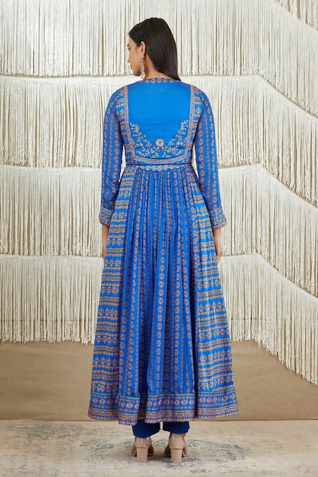 Royal blue anarkali with zardozi embroidered bodice, cuffs & printed motifs. Paired with tassel belt, trouser & printed dupatta.