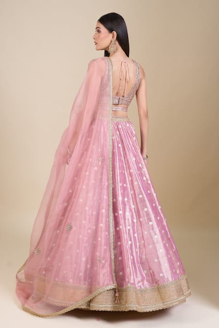 Pink Tissue Sequins, Zari, Embroidery V-neck Zardozi Lehenga Set