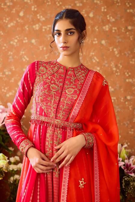 Mandarin neckline with intricate zardozi work, Woven buttis along the hem, Coordinating belt with embellishments