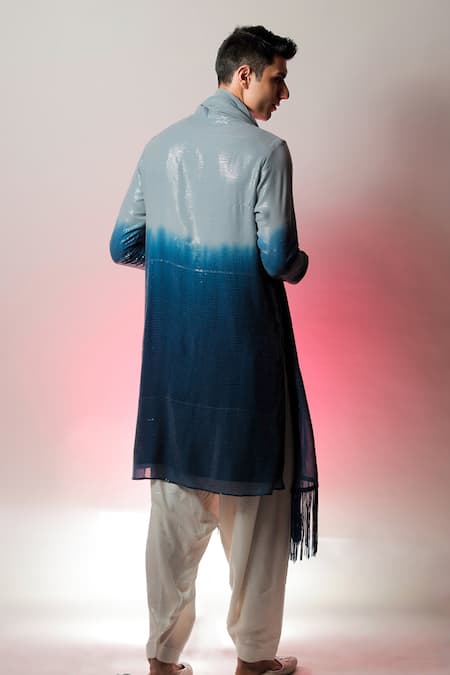Blue ombre kurta with sequins work. Paired with ombre stole & off-white sequins dhoti pant.