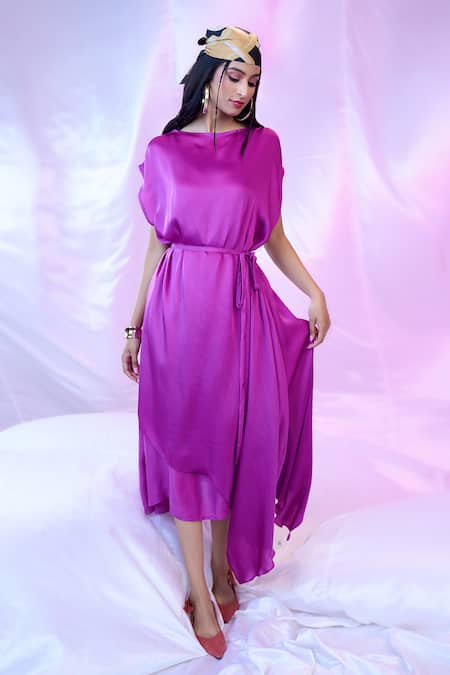 Purple asymmetric layered dress featuring draped sleeves and a belt. Designed in shantoon and satin georgette fabric for a relaxed fit.