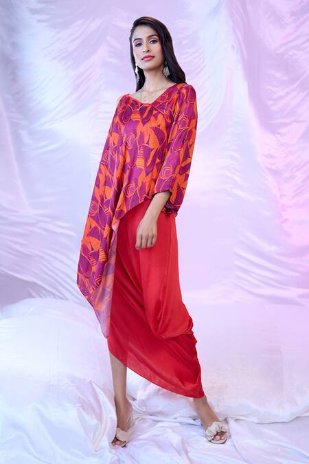 Red Satin, Georgette Embroidery Asymmetric Cowl Dress With Printed Overlay