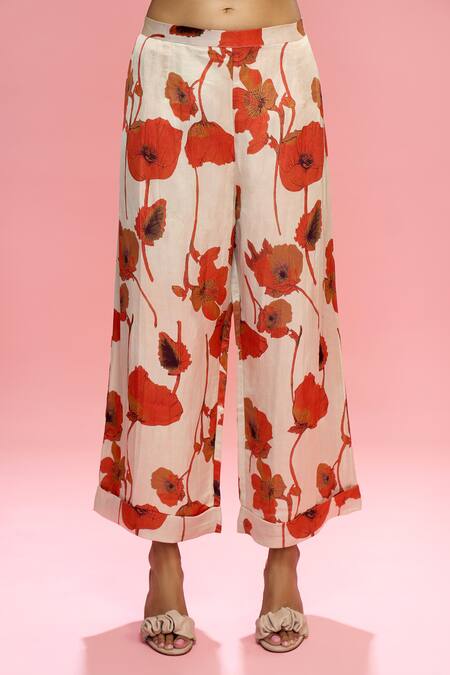 Orange draped top in satin georgette base with flared sleeves. Paired with floral printed pant for a coordinated look.