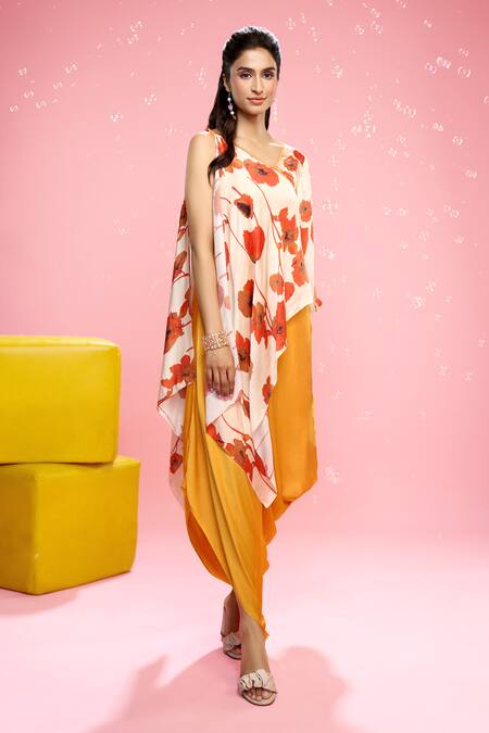 Orange satin georgette dress featuring a V neck and asymmetric sleeves with a peach floral print. Paired with a matching slip for added comfort.