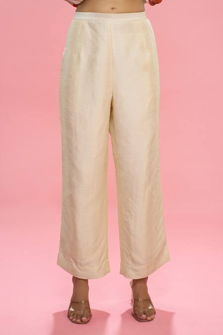 Ivory satin georgette top featuring a halter neckline and floral print. Paired with art silk pant and a butter crepe slip.