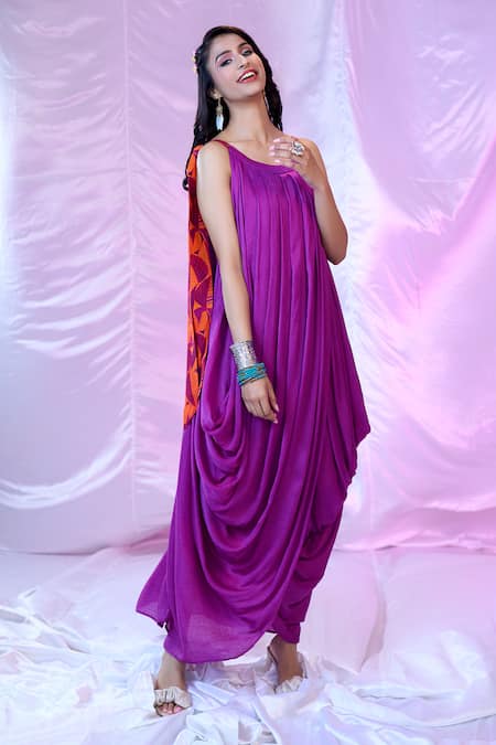 Purple maxi dress in satin georgette featuring pleated cowl detailing. Paired with a butter crepe slip for added comfort.