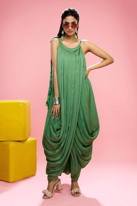 Green Satin, Chiffon, Silk Round Neck Solid Pleated Cowl Dress