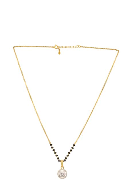 A 925 silver mangalsutra featuring a gold plating, black beads, and a circular pendant embellished with white stones.