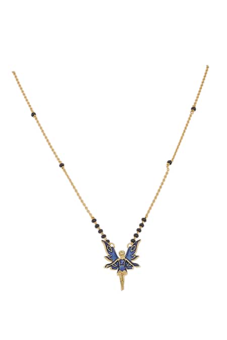 Black designer mangalsutra featuring a fairy motif in 925 silver with gold plating.