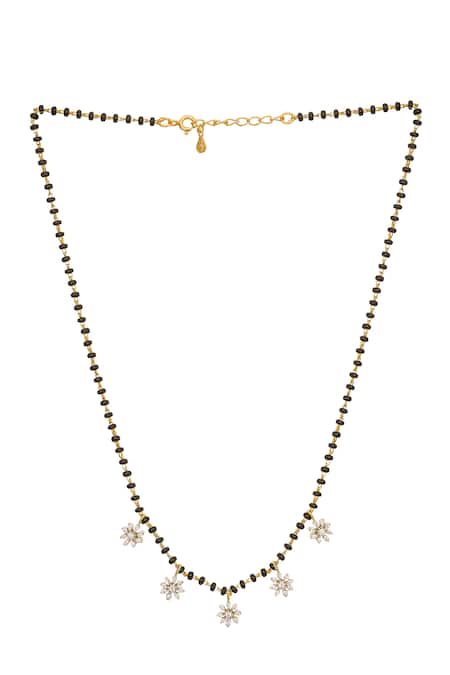 A gold plated 925 silver mangalsutra featuring small black beads and five floral charms with white stones.