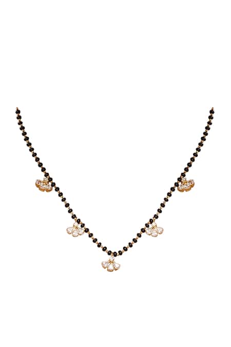 A gold plated 925 silver mangalsutra features a black beaded chain with marquise shaped white stone studded motifs.
