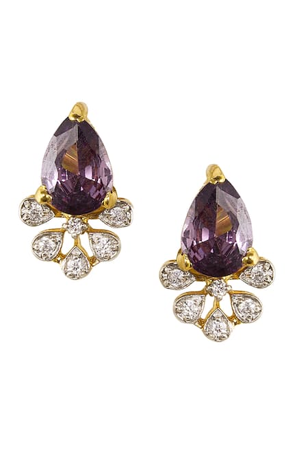 Teardrop shaped purple stone, Cluster of small clear stones below main stone, Gold plated finish