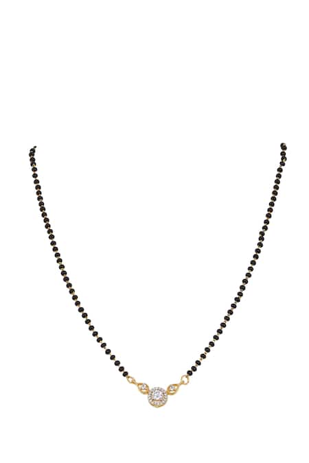 Black mangalsutra featuring a central gold-toned pendant with stone embellishments.
