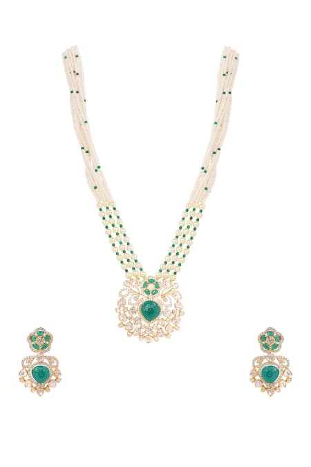 Rhodium gold plated floral bead necklace featuring clear cubic zirconia stones and green carved stones. Paired with matching earrings adorned with similar embellishments.