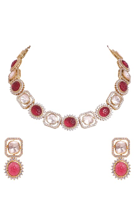 Designer jewellery set featuring a red-toned necklace adorned with cubic zirconia, moissanite polki, and synthetic stones. Includes a pair of matching earrings with similar embellishments.