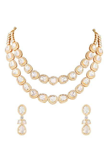 Yellow Diamonds, Crystals Double Line Polki Embellished Necklace Set
