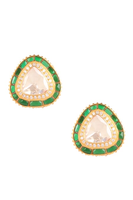Green moissanite polki stud earrings featuring a triangle pattern with synthetic stone embellishments