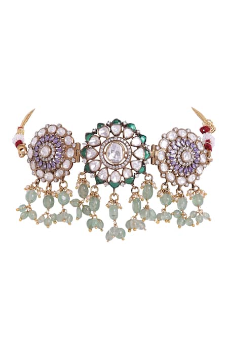 Green Moissanite Polki Embellished Floral Choker Necklace