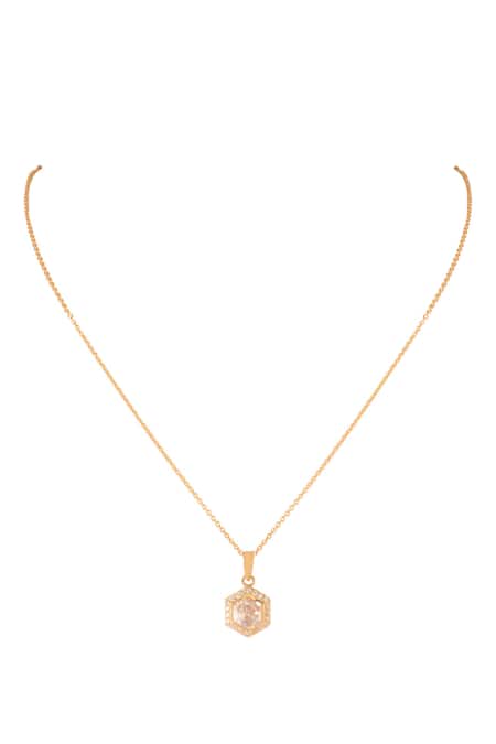 Gold finish pendant necklace featuring moissanite polki and synthetic stone embellishments in a hexagon design
