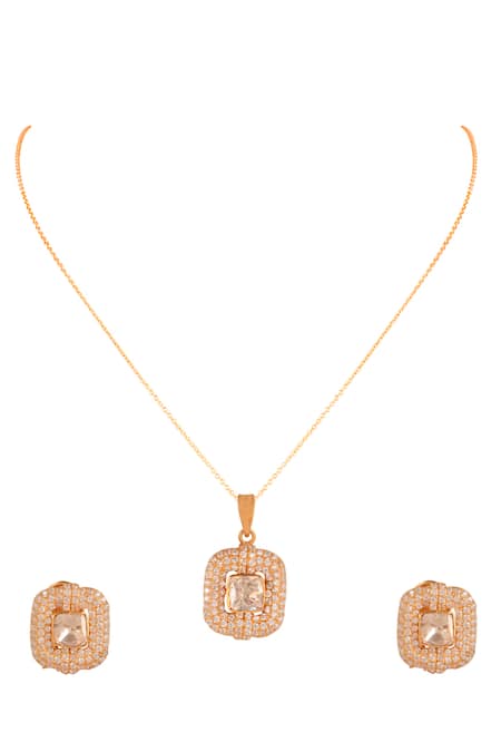 Gold finish pendant set featuring moissanite polki and synthetic stones embellishments. Includes a pendant and a pair of earrings with geometric patterns.