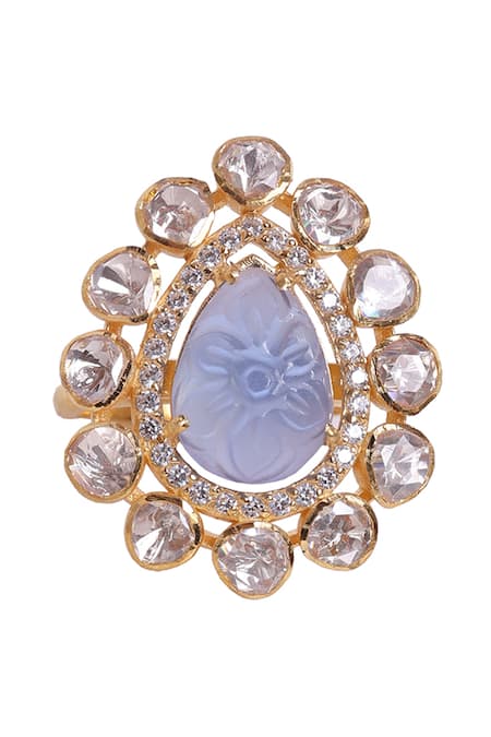 Gold plated 925 silver ring featuring a blue toned tear drop moissanite polki centerpiece surrounded by cubic zirconia embellishments