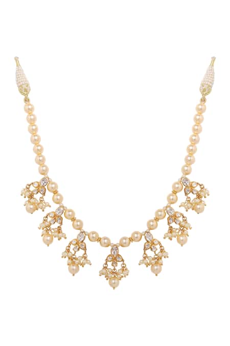 Rhodium gold plating for a luxurious finish, Intricate floral design with dangling pearls, Studded with moissanite polki for added sparkle