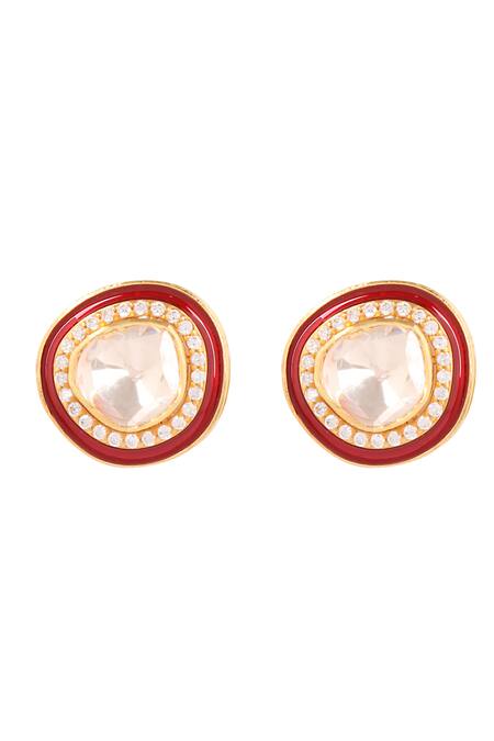 Red stud earrings made of 925 silver featuring a geometric pattern and embellished with zircons and moissanite polki