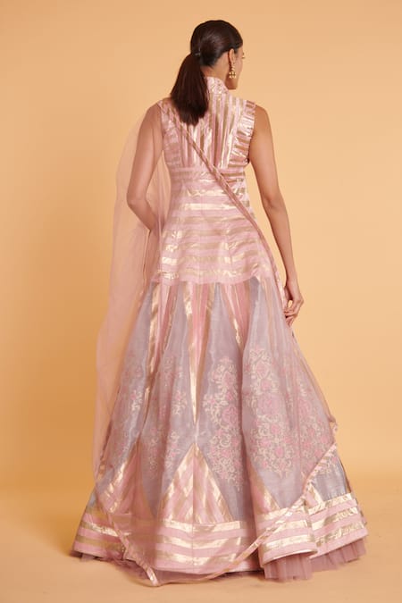 Engineered striped design on anarkali, Aari and crystal embroidery on organza, Blush tulle skirt adds volume