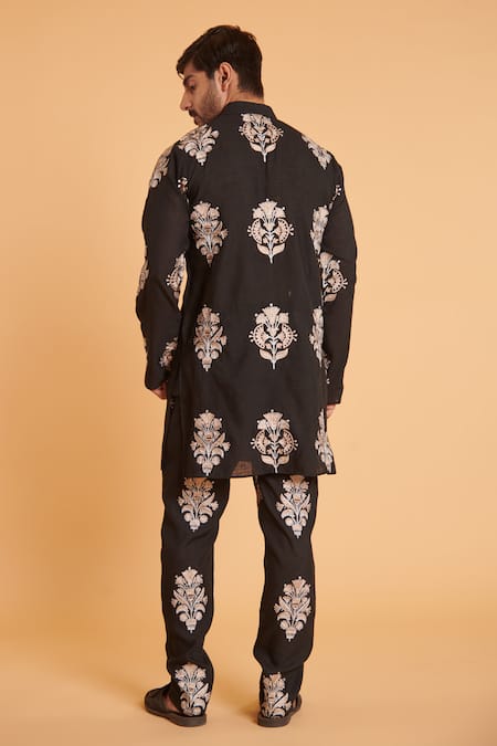Black kurta featuring all-over floral aari work with a mandarin collar. Paired with matching pants for a complete look.