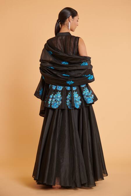 Black chanderi anarkali featuring gradient blue threadwork booties. Paired with an umbrella skirt and matching dupatta.