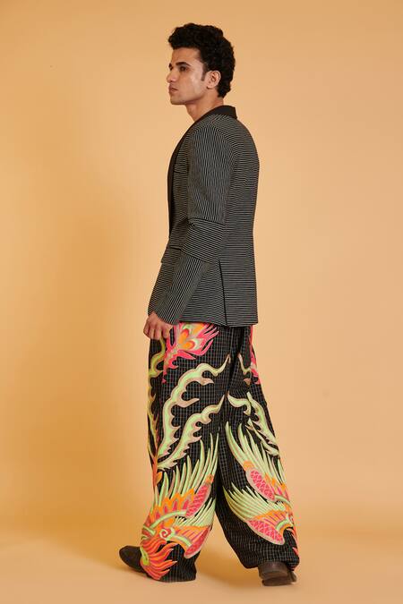 Black and white oversized pant featuring checkered print and thread applique embroidery in a phoenix birds pattern
