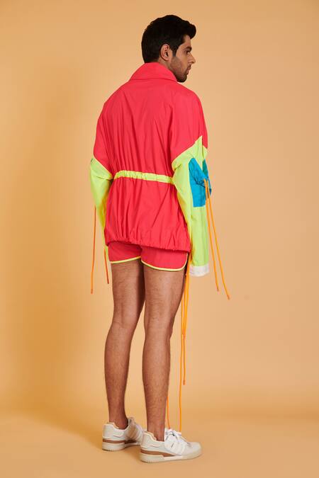 Multicolor colorblock parka featuring a high neck, full sleeves, and a front zipper closure. Paired with matching shorts that have an elasticated waistband and side pockets.