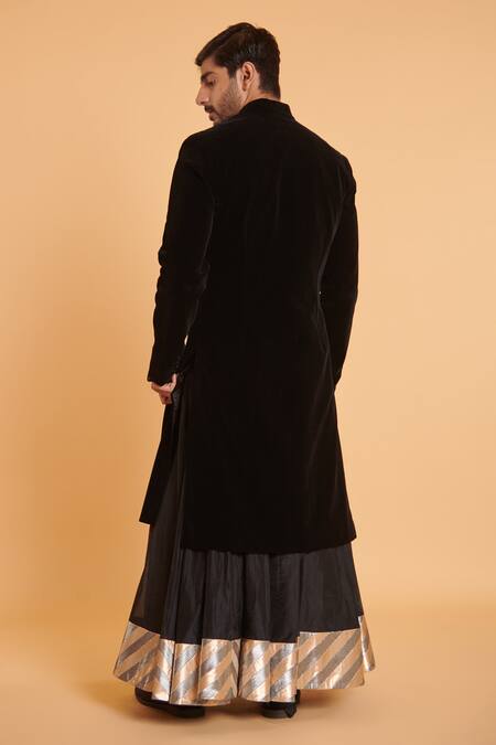 Black Velvet, Silk Embroidery Crest Sherwani With Flared Pant