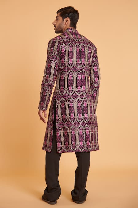 Black and purple sherwani featuring all-over embroidery with crystal and aari work in a floral pattern. Paired with a matching pant for a complete look.