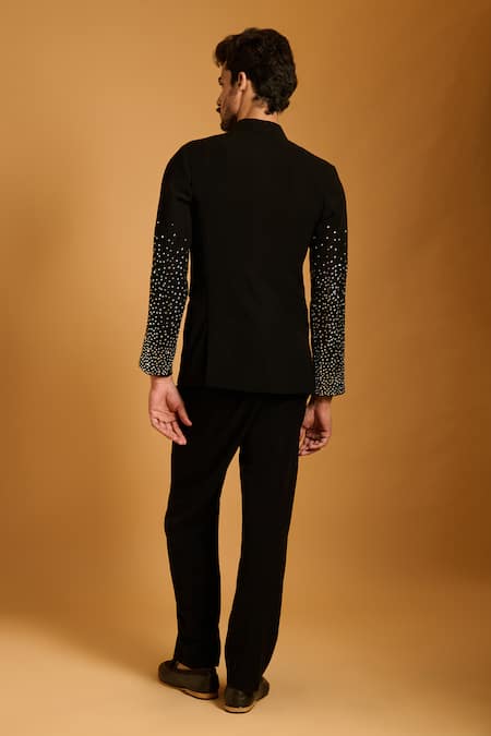 A black bandhgala crafted from Japanese knit and micro fiber fabric, featuring a mandarin collar and silver crystal gradient embellishments on the sleeves. It is paired with coordinating black pants.