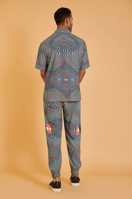 Multicolor shirt featuring a diffraction digital print with a spread collar and half sleeves. Paired with joggers that have an elasticated hem.