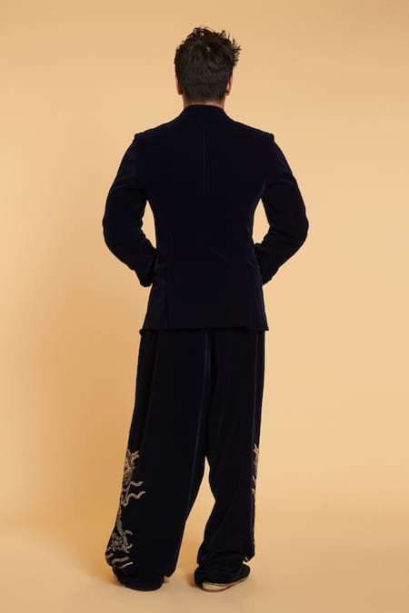Navy velvet oversized pants with crystal chain dragon motif embroidery.