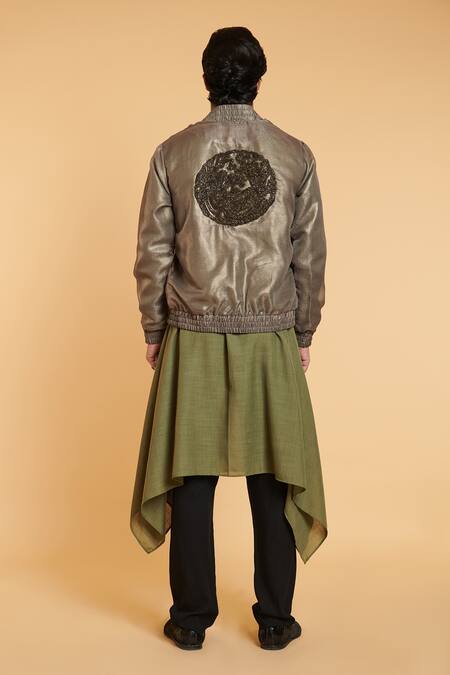 Olive draped kurta with metal sequin embroidery. Comes with pant.