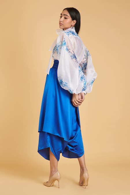 Blue lycra satin dhoti pants with elasticated waist & overlay detail.