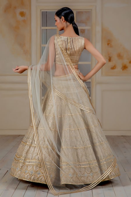 Beige taffeta 20-kali lehenga with zari- crystal work. Comes with striped detail embroidered blouse with crystal highlight net dupatta.