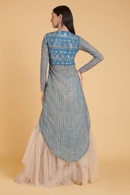 Beige tulle high low jacket with blue thread & sequin work in floral motifs.