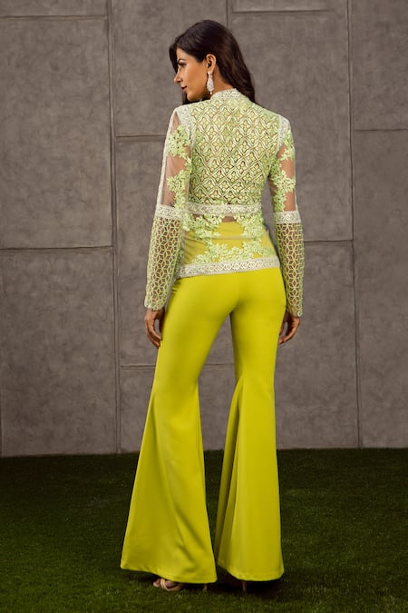 Green Net High Neck Embroidered Top