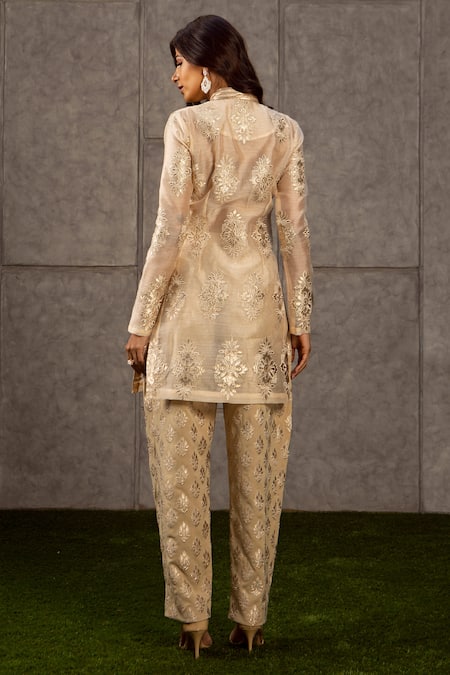 Beige Organza, Lame Mandarin Collar Floral Applique Jacket