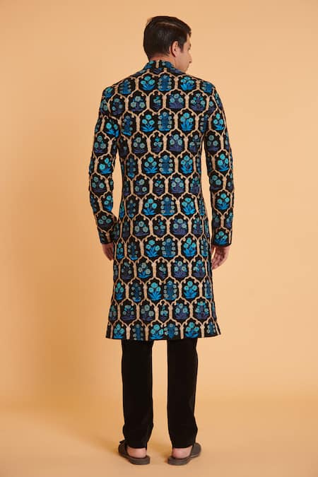 Black velvet sherwani featuring all-over floral embroidery with crystal, zari, and blue threadwork. Paired with matching lycra knit pant.