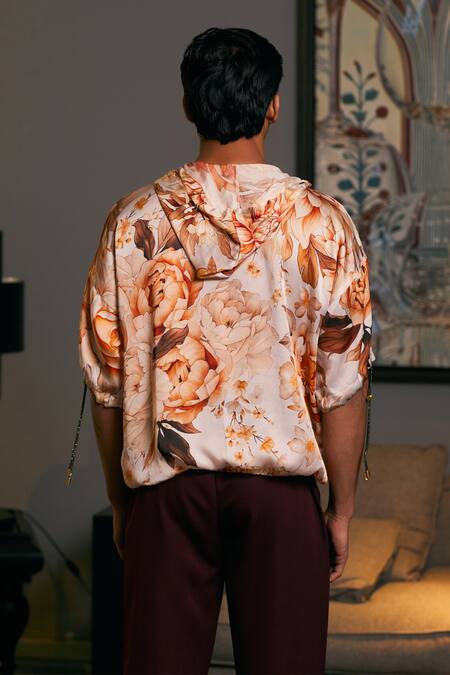 Crystal toggle detail on the zipper, Front pocket with floral print, Half sleeves with drawstring detail